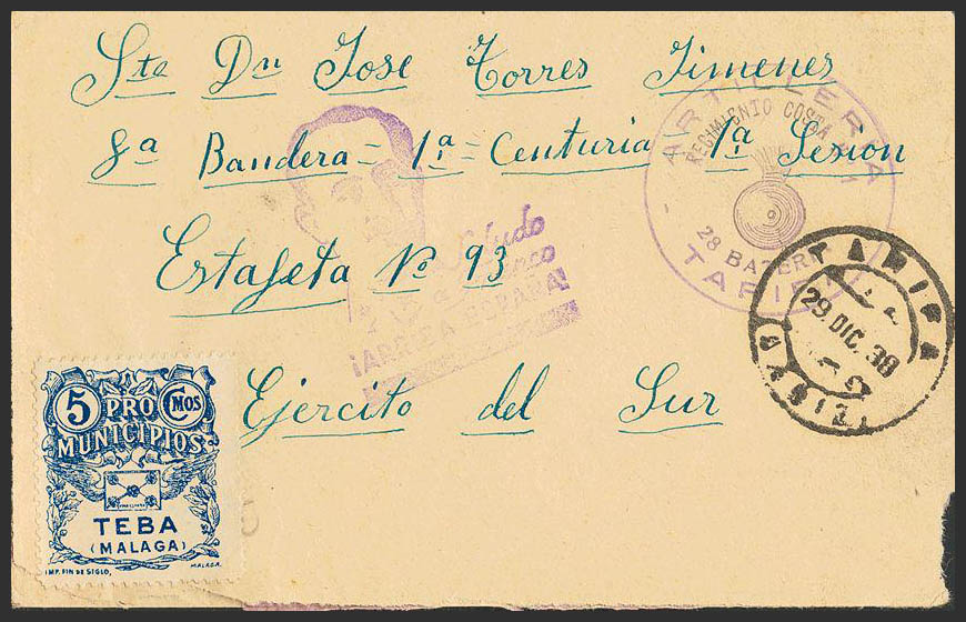 AndalucÃa. Historia Postal. TARIFA / (CADIZ), franquicia ARTILLERIA / REGIMIENTO COSTA Nº1 / 28 BATERIA / TARIFA. MAGNIFICA.