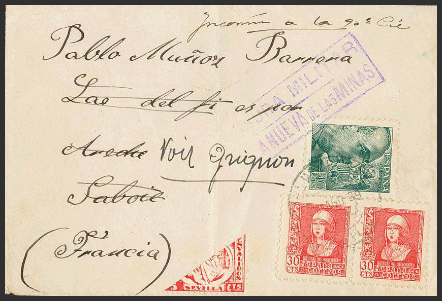 AndalucÃa. Historia Postal. CENSURA MILITAR / VILLANUEVA DE LAS MINAS, al dorso llegada. MAGNIFICA.