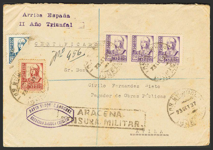 AndalucÃa. Historia Postal. ARACENA / CENSURA MILITAR, al dorso tránsito. MAGNIFICA.