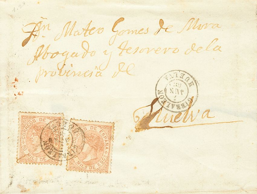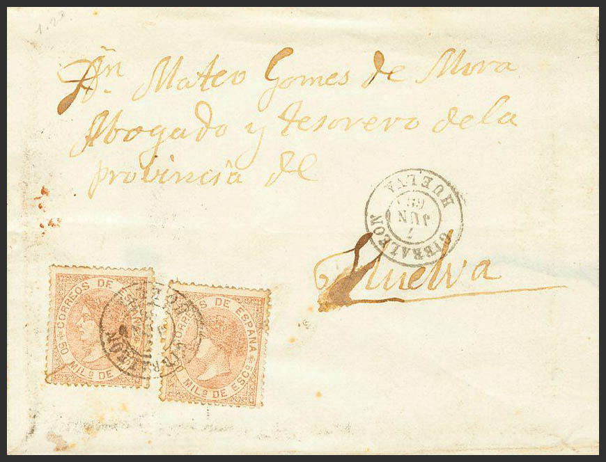 AndalucÃa. Historia Postal. GIBRALEON / HUELVA, doble porte. MAGNIFICA.