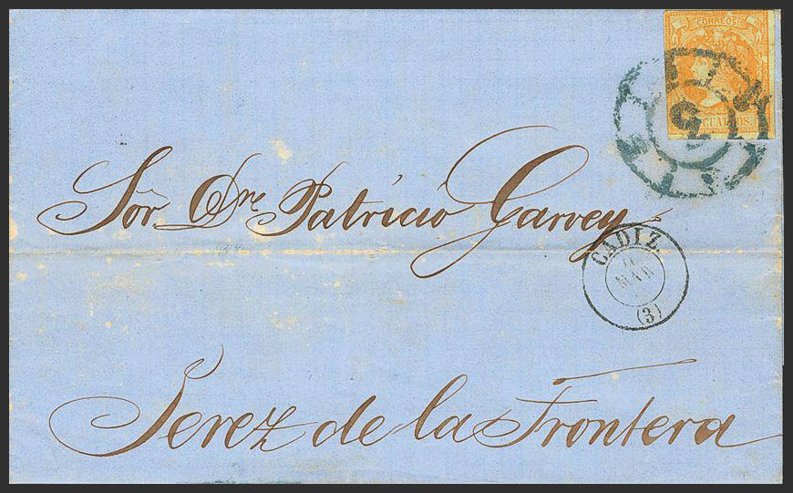 52. 1861. 4 cuartos naranja. CADIZ a JEREZ DE LA FRONTERA. Matasello R.CARRETA Nº3, en azul. MAGNIFICA Y RARA.