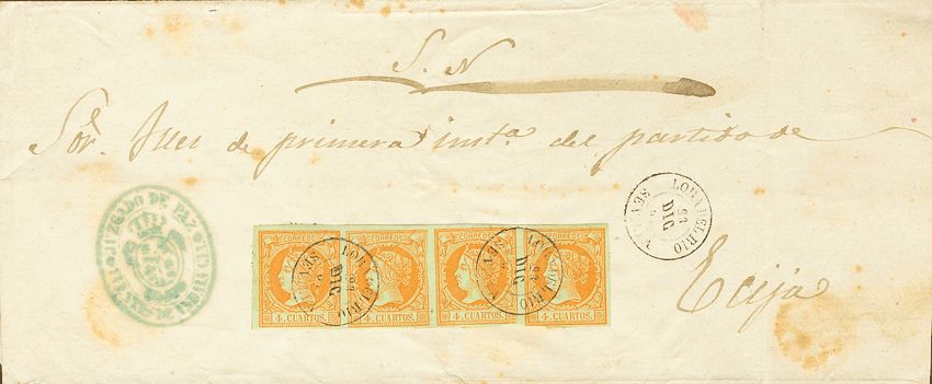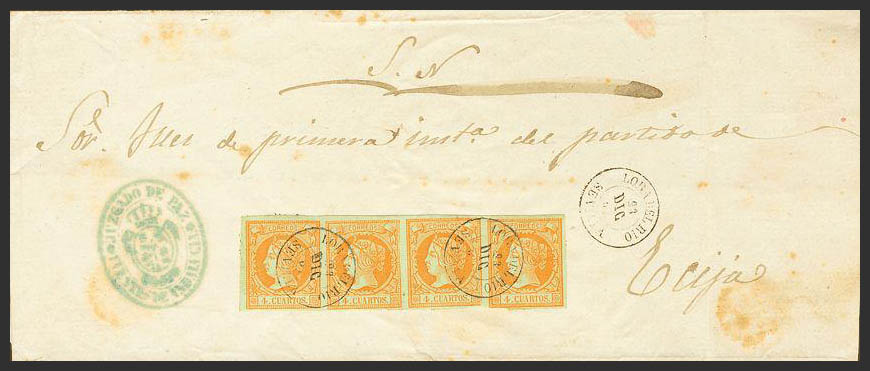 52(4). 1860. 4 cuartos naranja, tira de cuatro. Plica Judicial de LORA DEL RIO a ECIJA. Matasello LORA DEL RIO / SEVILLA, en el frente marca JUZGADO DE PAZ / FUENTES DE ANDALUCIA. MAGNIFICA.