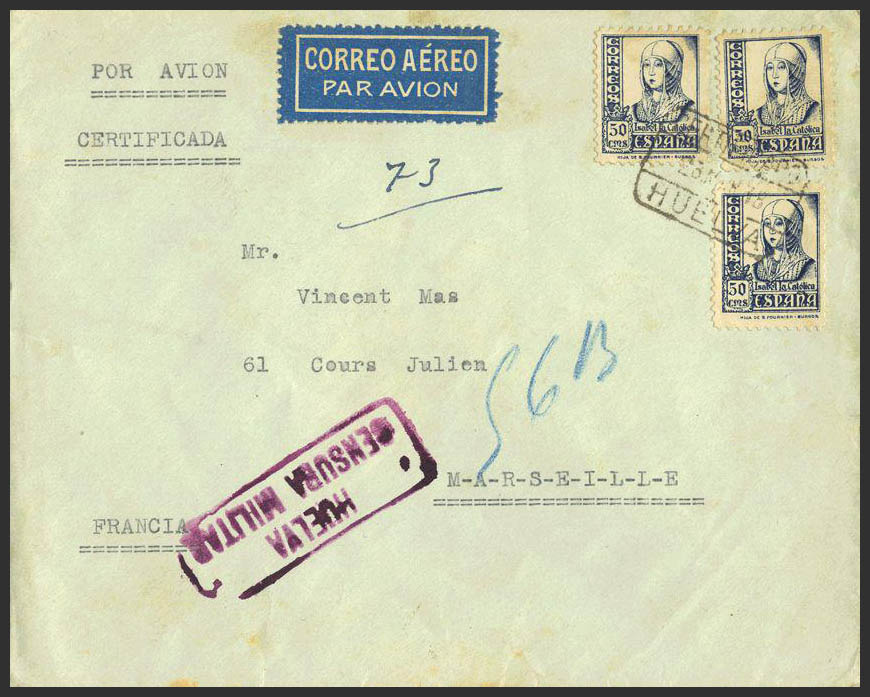 AndalucÃa. Historia Postal. CERTIFICADO / HUELVA, al dorso llegada. MAGNIFICA.