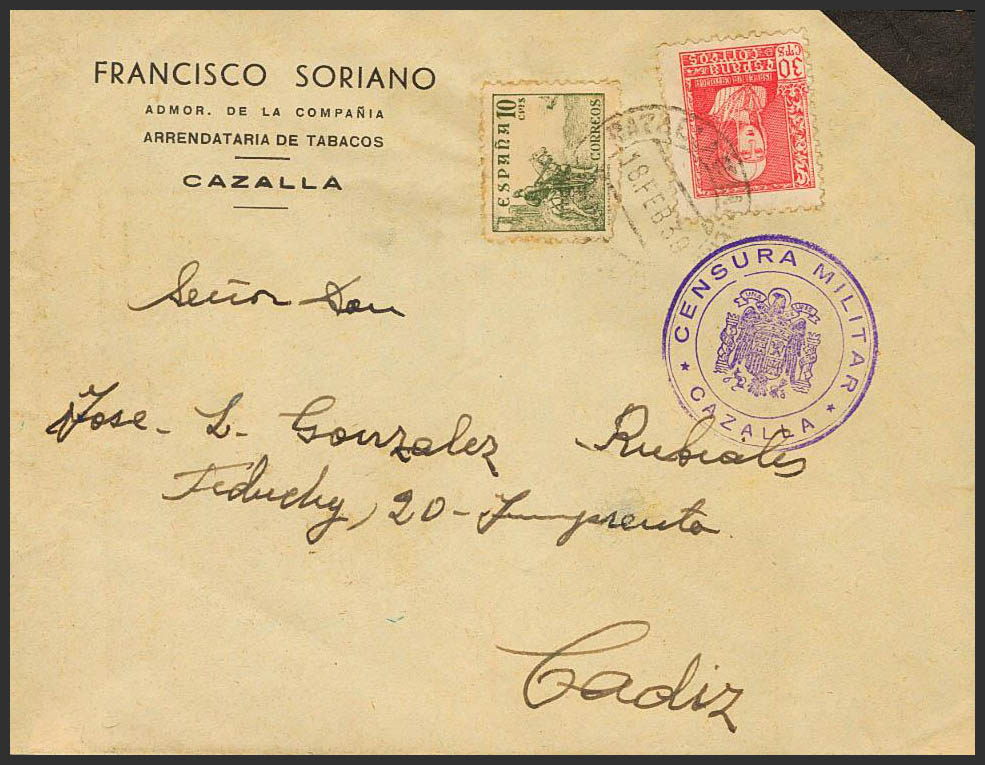 AndalucÃa. Historia Postal. CENSURA MILITAR / CAZALLA. MAGNIFICA.