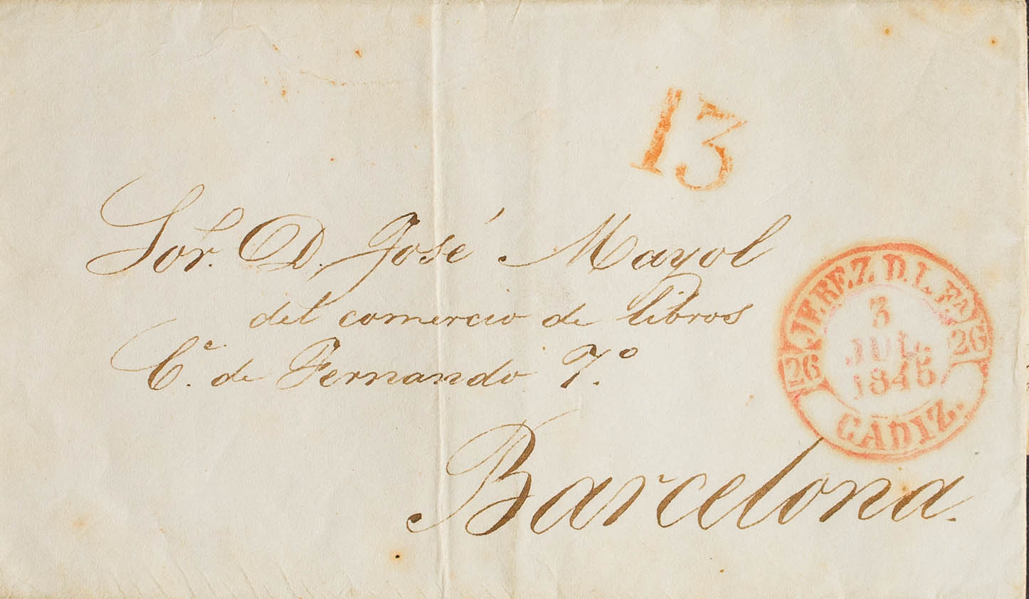 1845. JEREZ DE LA FRONTERA a BARCELONA. Baeza JEREZ D.L.Fª / CADIZ, en rojo. MAGNIFICA.