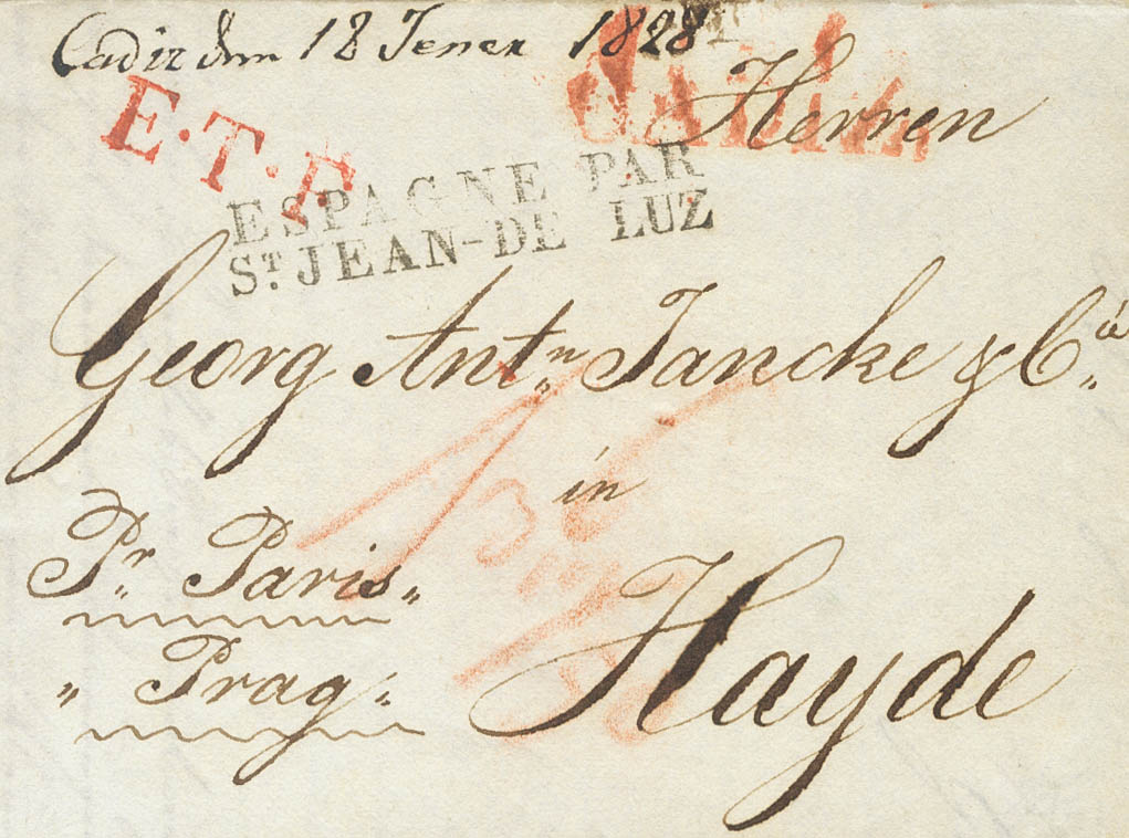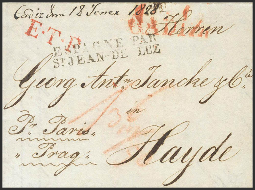 1828. CADIZ a HAIDA (IMPERIO AUSTRO HUNGARO). Marca CADIZ (P.E.17). MAGNIFICA E INUSUAL DESTINO.