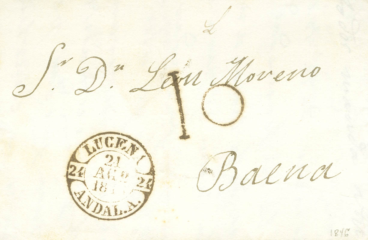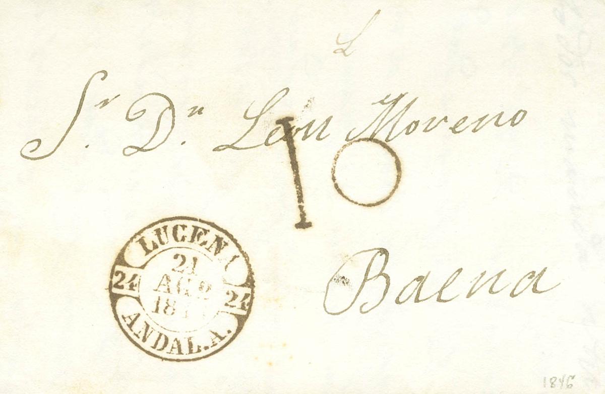 1846. LUCENA (CORDOBA) a BAENA. Baeza LUCENA / ANDAL.A., en rojo oxidado. MAGNIFICA.