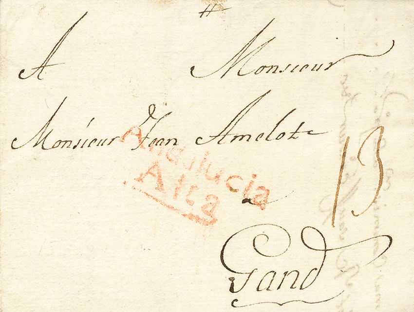 1760. SEVILLA a GAND (FRANCIA). Marca ANDALUCIA / ALTA, en rojo (P.E.5) edición 2004. MAGNIFICA Y MUY RARA.