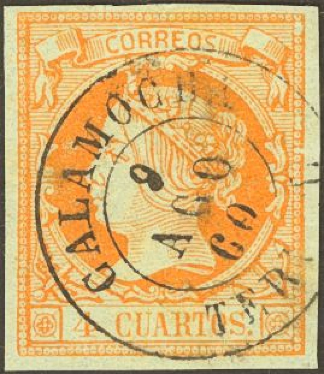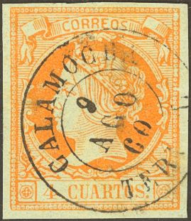 52. 1860. 4 cuartos naranja. Matasello CALAMOCHA / TERUEL. MAGNIFICO.