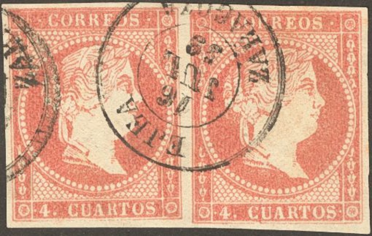 48(2). 1856. 4 cuartos rojo, pareja. Matasello EJEA / ZARAGOZA. LUJO.