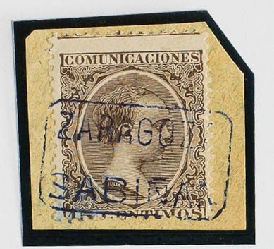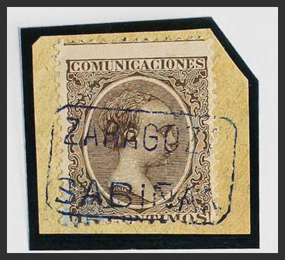 △ 219. 1889. 15 cts castaño, sobre fragmento. Matasello carterÃa ZARAGOZA / SABIÑAN, en azul-violeta. MAGNIFICA.