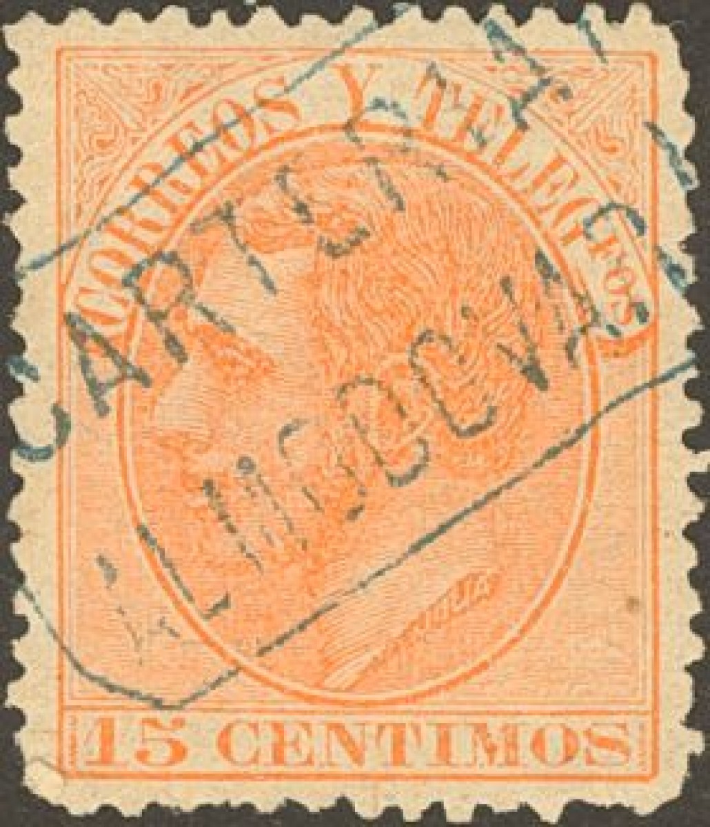 210. 1882. 15 cts naranja. Matasello CARTERIA / ALMODOVAR, en azul. MAGNIFICO.