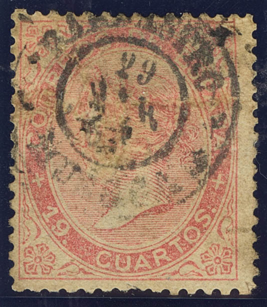 90. 1867. 19 cuartos rosa (pequeños defectos). Matasello BARBASTRO / HUESCA. BONITO Y RARO.