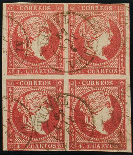 48(4). 1855. 4 cuartos rojo, bloque de cuatro. Matasello ALIAGA / TERUEL. MAGNIFICO Y MUY RARO.