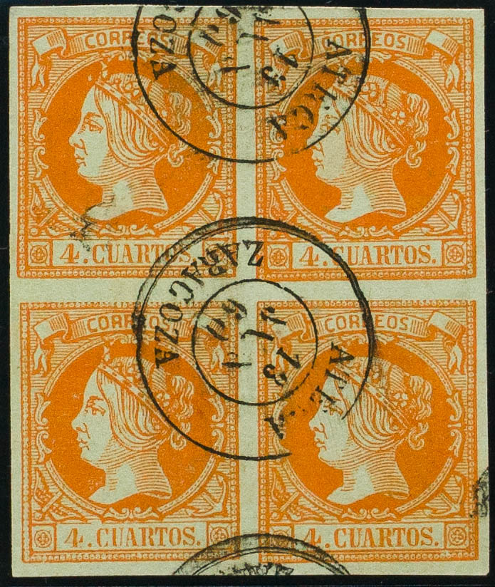 52(4). 1860. 4 cuartos naranja, bloque de cuatro. Matasello ATECA / ZARAGOZA. MAGNIFICO.