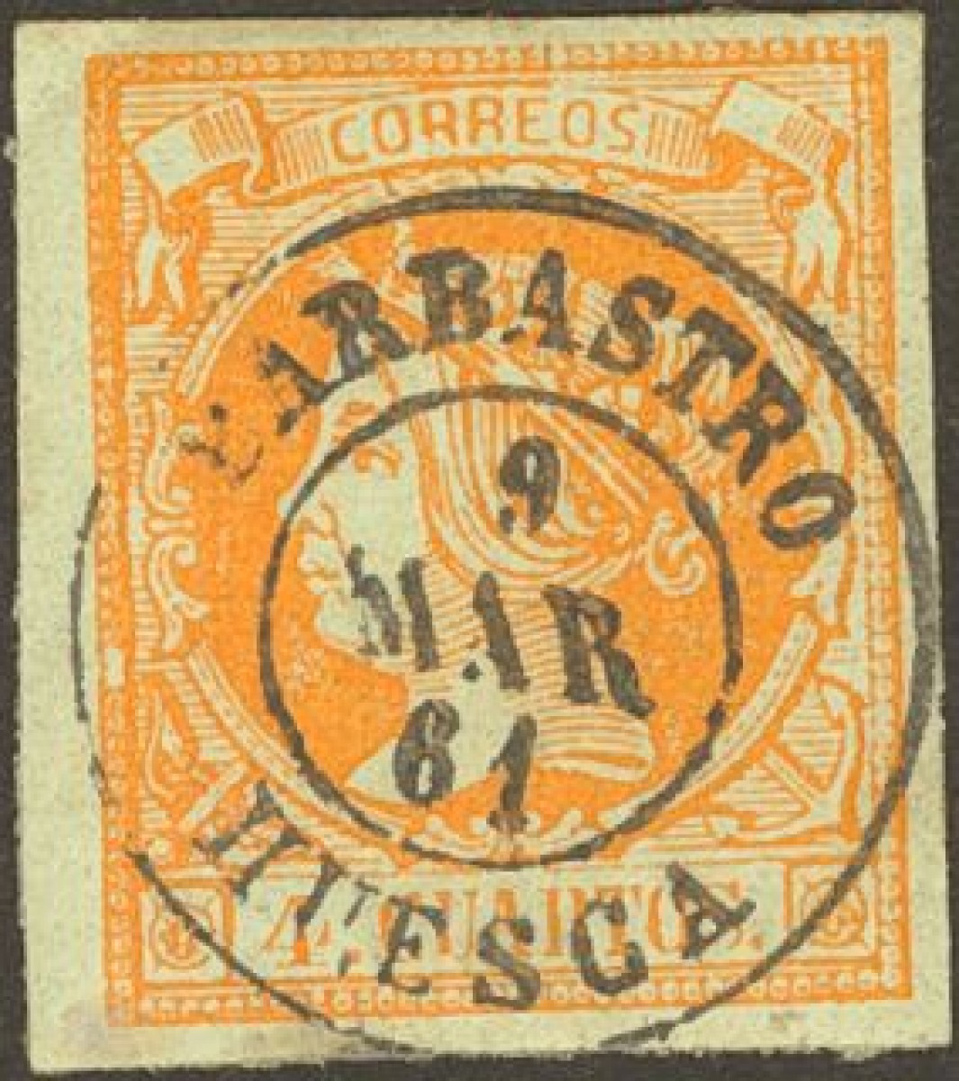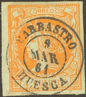 52. 1860. 4 cuartos amarillo. Matasello BARBASTRO / HUESCA. MAGNIFICO.