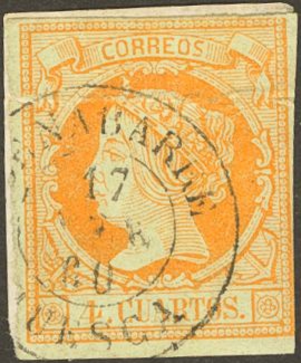 52. 1860. 4 cuartos amarillo. Matasello BENABARRE / HUESCA, ligero doblez.