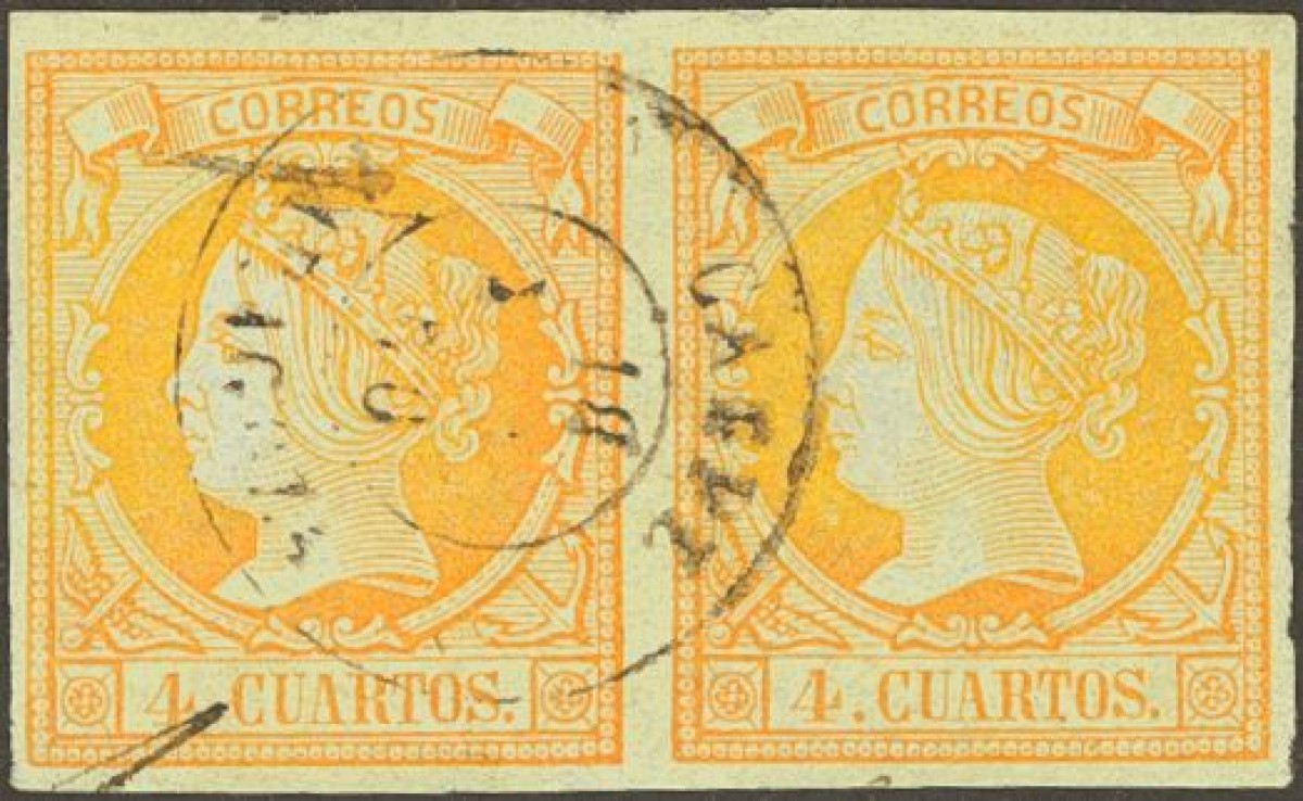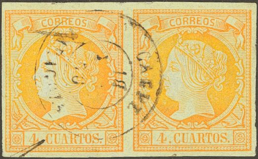 52(2). 1860. 4 cuartos amarillo. pareja. Matasello CASPE / ZARAGOZA.