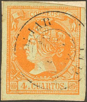 52. 1860. 4 cuartos amarillo. Matasello HIJAR / TERUEL.