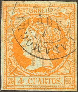 52. 1860. 4 cuartos amarillo. Matasello CALAMOCHA / TERUEL.