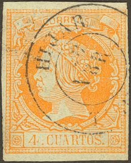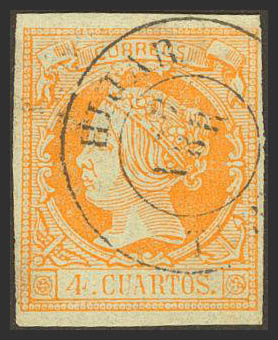 52. 1860. 4 cuartos amarillo. Matasello HIJAR / TERUEL. MAGNIFICO.