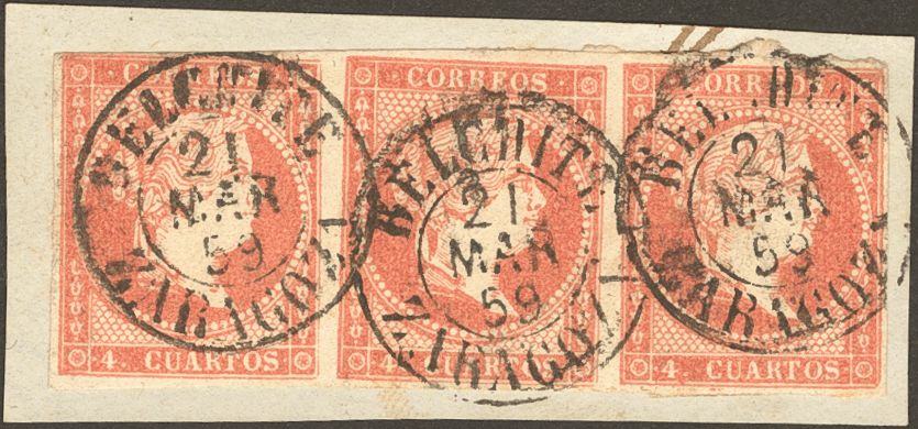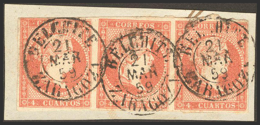 △ 48(3). 1856. 4 cuartos rojo, tira de tres, sobre fragmento. Matasello BELCHITE / ZARAGOZA (Tipo I). MAGNIFICA.