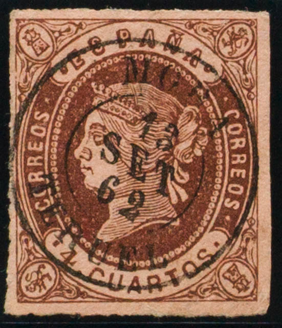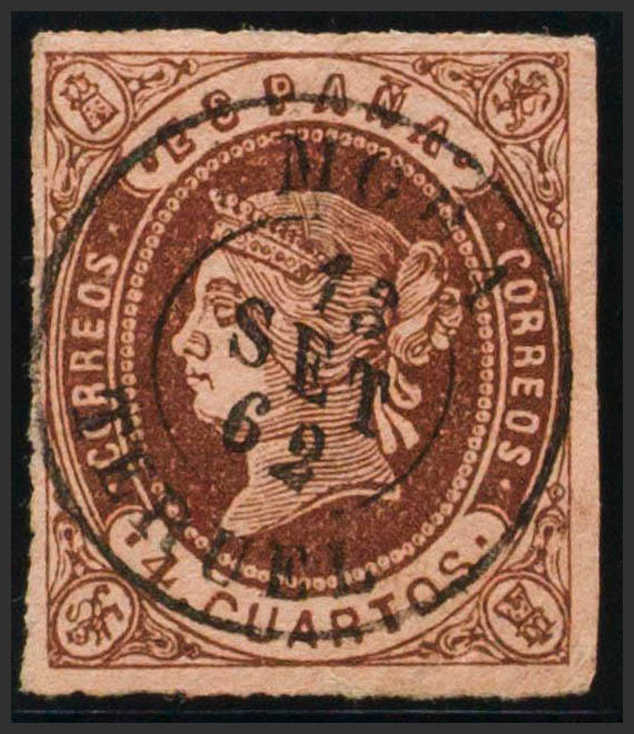 58. 1862. 4 cuartos castaño. Matasello MORA / TERUEL. MAGNIFICO.