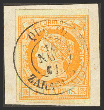 △ 52. 1860. 4 cuartoa amarillo, sobre fragmento. Matasello QUINTO / ZARAGOZA. MAGNIFICO.