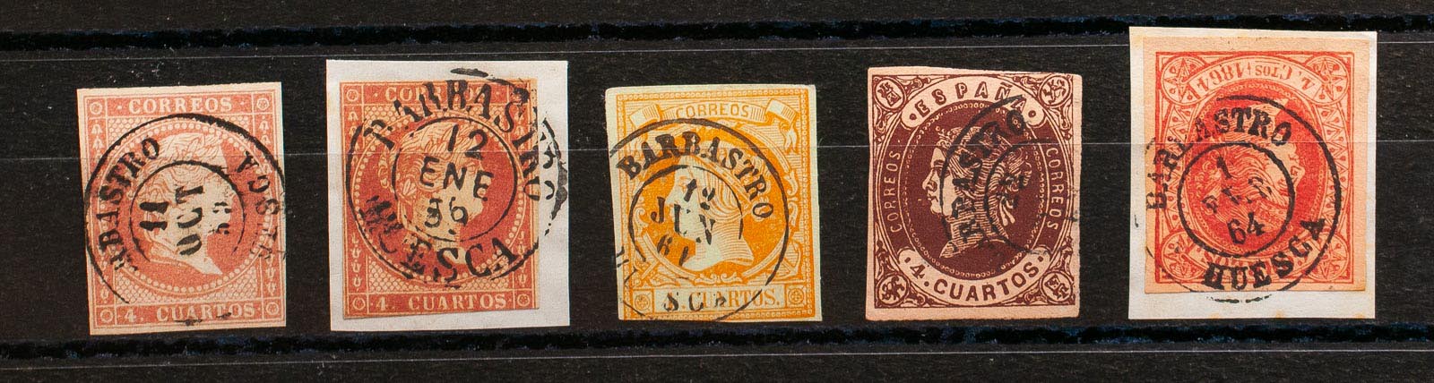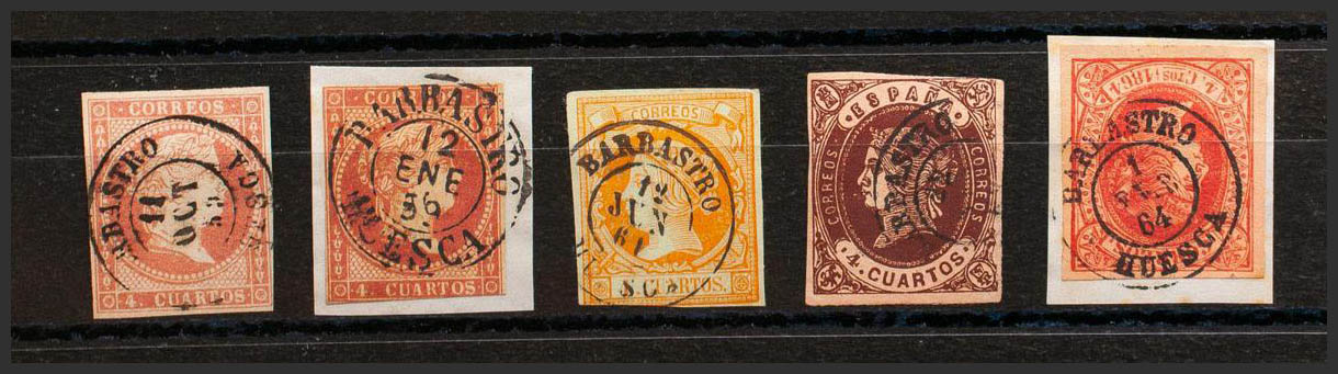 48(2), 52, 58, 64. (1855ca). Conjunto de cinco sellos del 4 cuartos rojo, amarillo, castaño y rosa, inutilizados con el matasello BARBASTRO / HUESCA (incluyendo el Tipo I sobre el 4 cuartos rojo). MAGNIFICO.