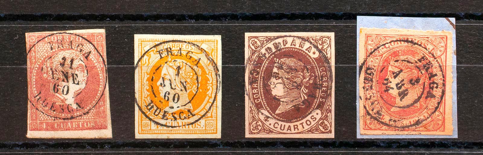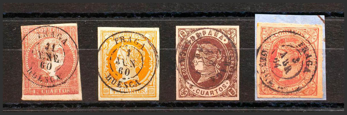48, 52, 58, 64. (1855ca). Conjunto de cuatro sellos del 4 cuartos rojo, amarillo, castaño y rosa, inutilizados con matasello FRAGA / HUESCA. MAGNIFICO.