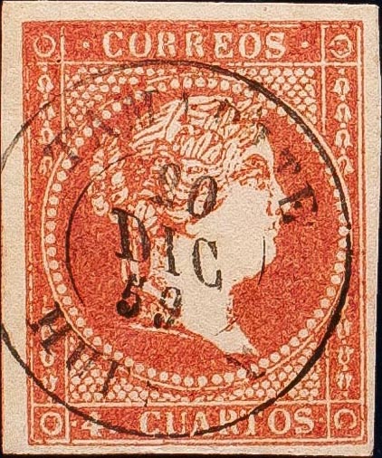 48. 1855. 4 cuartos rojo. Matasello TAMARITE / HUESCA. MAGNIFICO Y RARO.