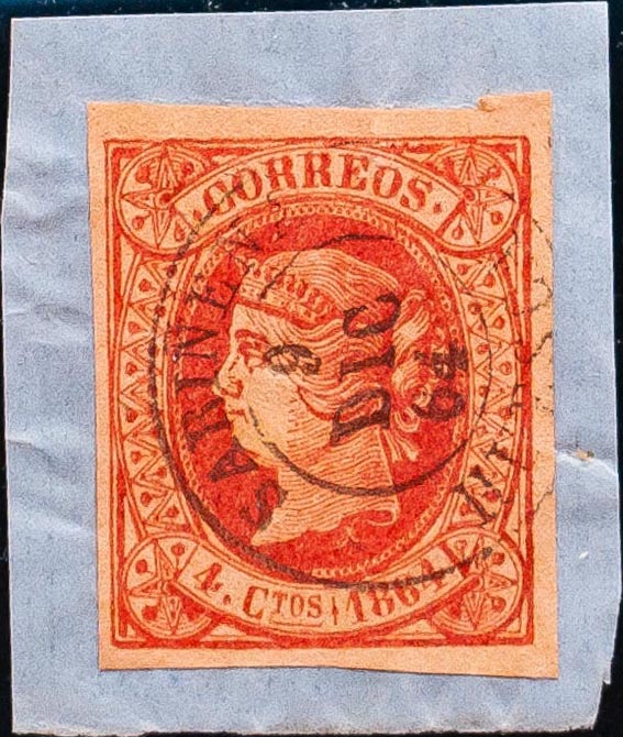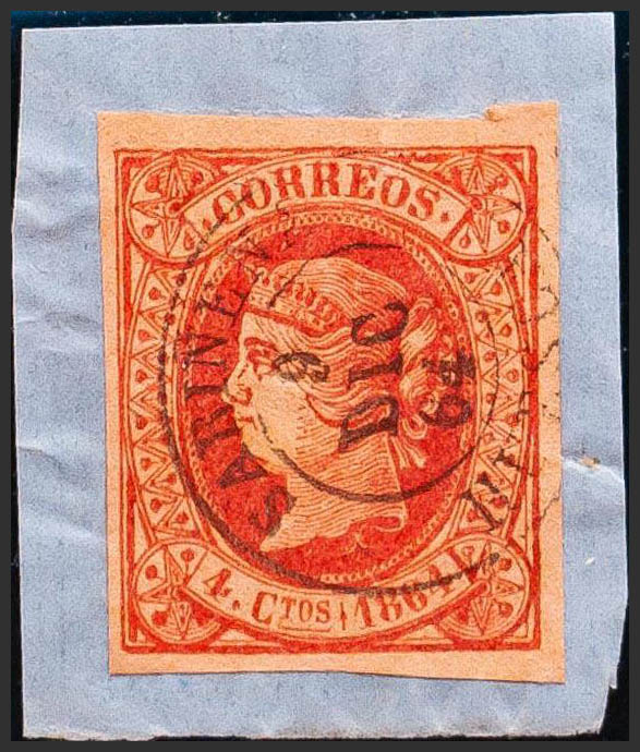 △ 64. 1864. 4 cuartos rosa, sobre fragmento. Matasello SARIÑENA / HUESCA. MAGNIFICO.