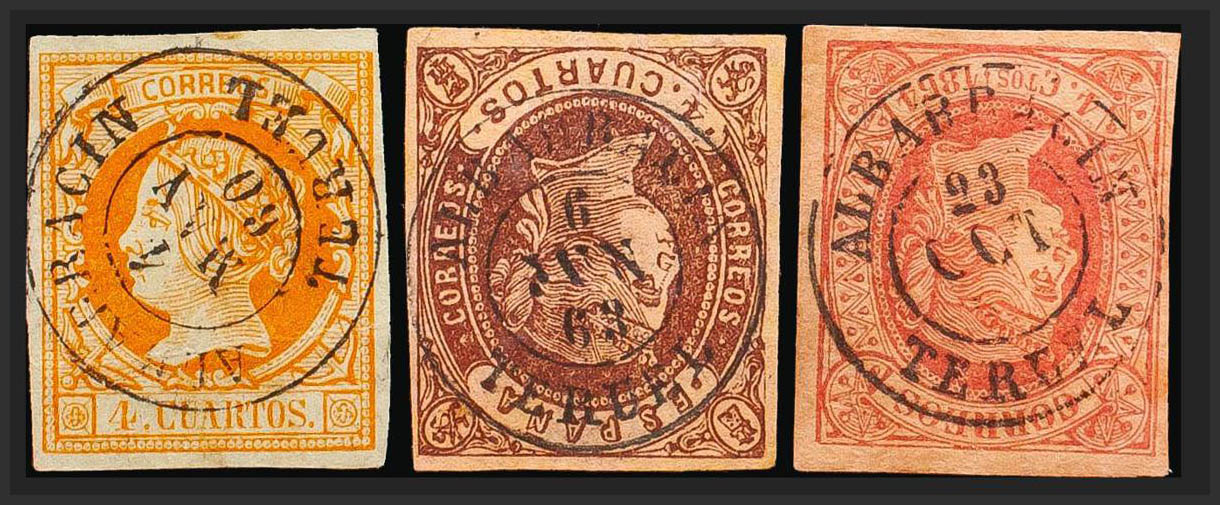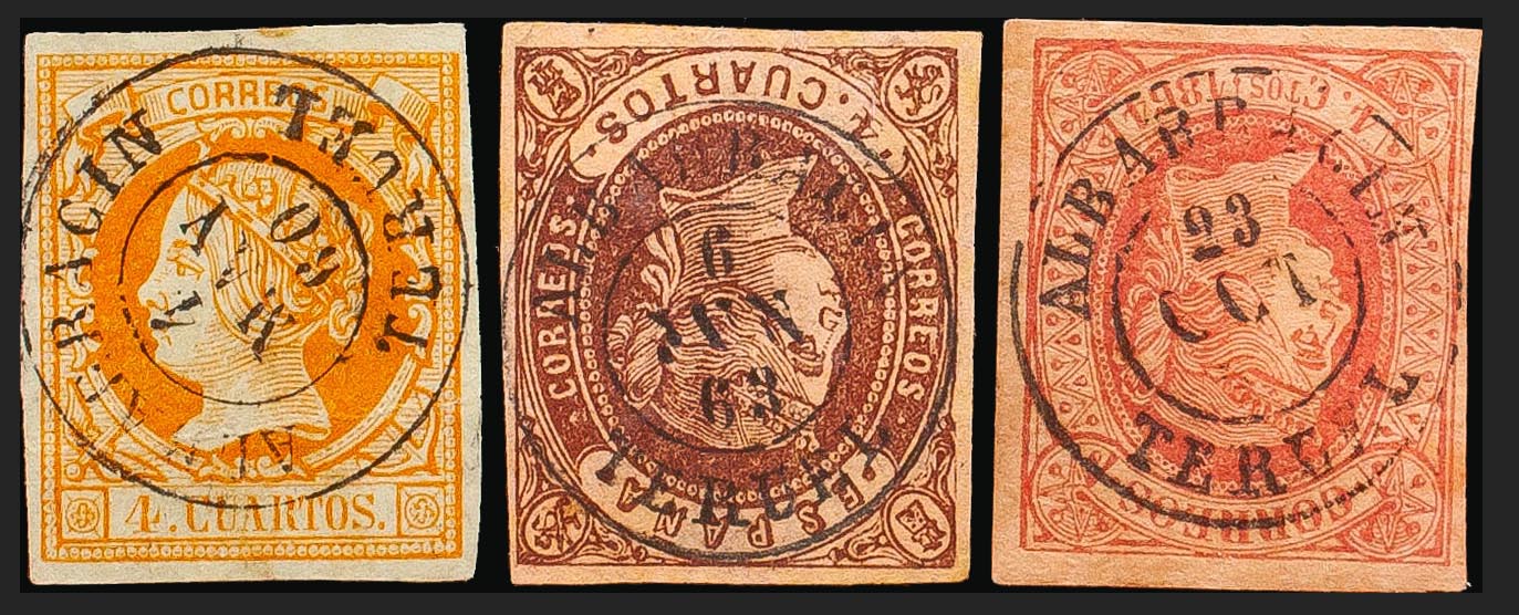52, 58, 64. (1860ca). Conjunto de tres sellos del 4 cuartos amarillo, castaño y rosa, inutilizados con el matasello ALBARRACIN / TERUEL. MAGNIFICO.
