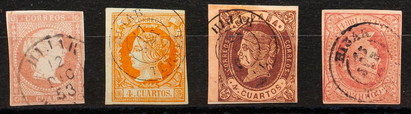 48, 52, 58, 64. (1855ca). Conjunto de cuatro sellos del 4 cuartos rojo, amarillo, castaño y rosa, inutilizados con matasello HIJAR / TERUEL (Tipo I en el 4 cuartos rojo). MAGNIFICO.
