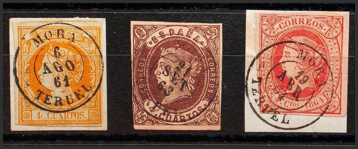 52, 58, 64. (1860ca). Conjunto de tres sellos del 4 cuartos amarillo, castaño y rosa, inutilizados con el matasello MORA / TERUEL. MAGNIFICO.