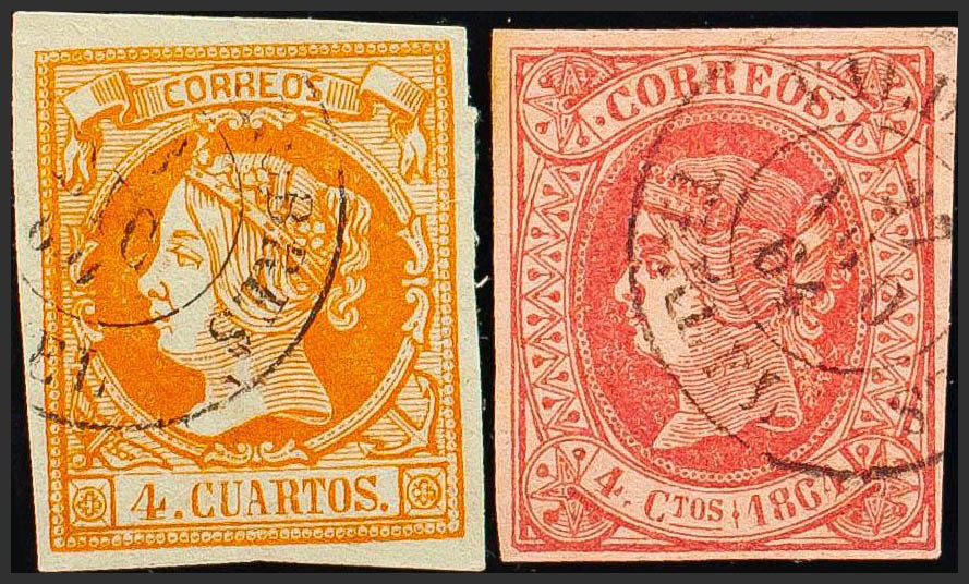 52, 64. (1860ca). Conjunto de dos sellos del 4 cuartos amarillo y 4 cuartos rosa, inutilizados con matasello VALDERROBRES / TERUEL. MAGNIFICO.