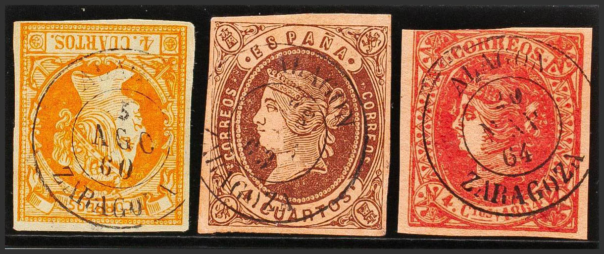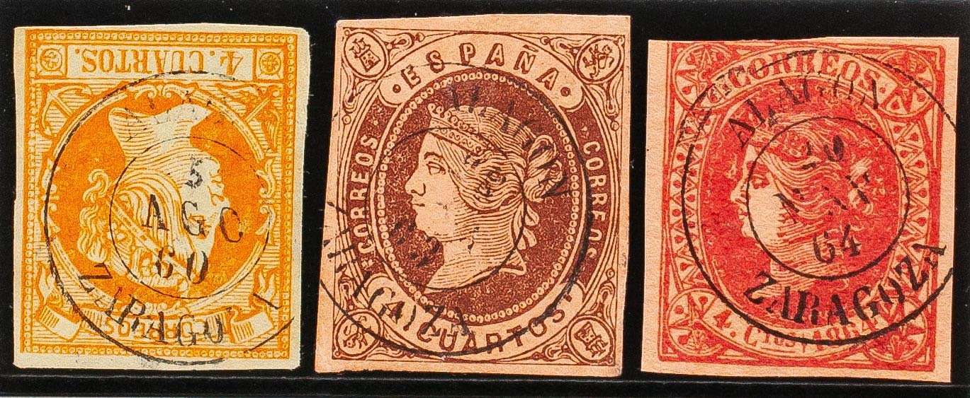 52, 58, 64. (1860ca). Conjunto de tres sellos del 4 cuartos amarillo, castaño y rosa, inutilizados con el matasello ALAGON / ZARAGOZA. MAGNIFICO.