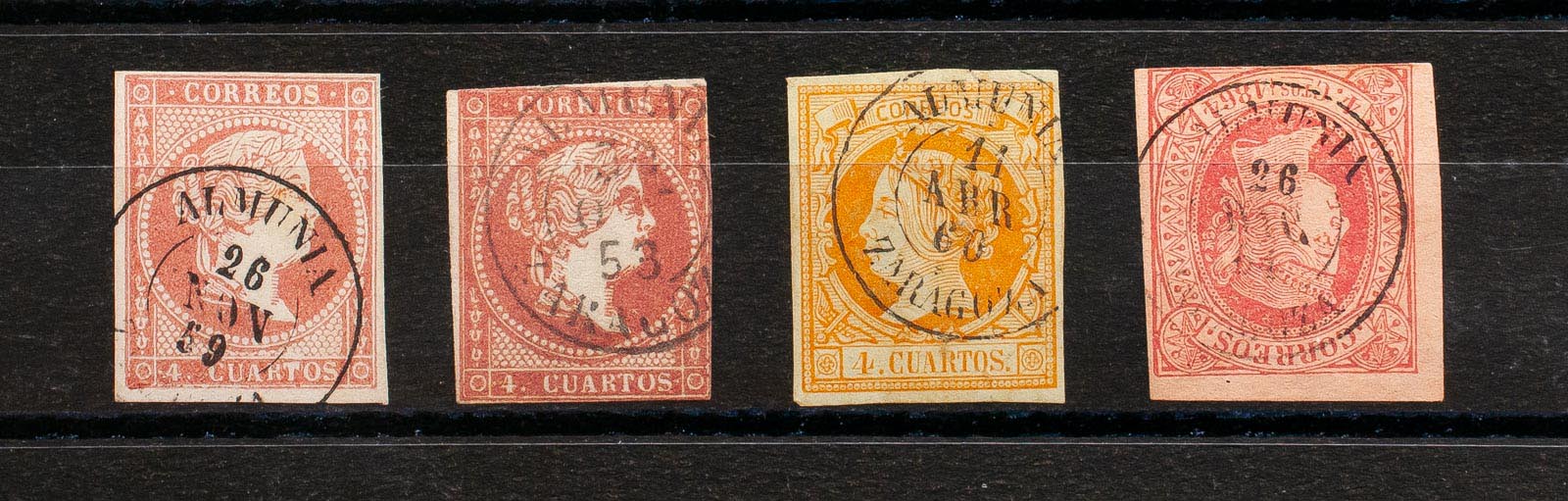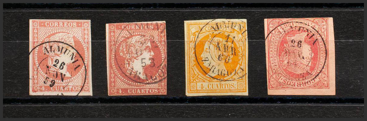 48(2), 52, 64. (1855ca). Conjunto de cuatro sellos del 4 cuartos rojo, amarillo y rosa, inutilizados con matasello ALMUNIA / ZARAGOZA (incluyendo el Tipo I sobre el 4 cuartos rojo). MAGNIFICO.
