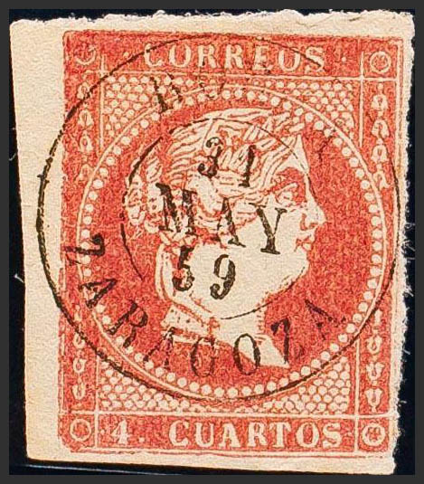 48. 1855. 4 cuartos rojo. Matasello BORJA / ZARAGOZA. MAGNIFICO.