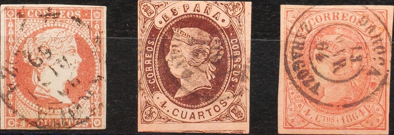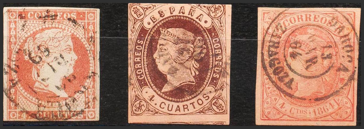 48, 58, 64. (1855ca). Conjunto de tres sellos del 4 cuartos rojo, castaño y rosa, inutilizados con el matasello DAROCA / ZARAGOZA (Tipo I en el 4 cuartos rojo). MAGNIFICO.