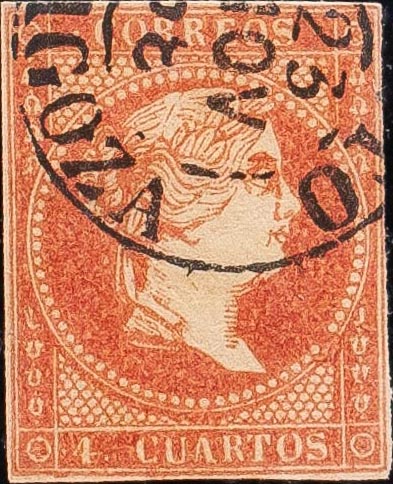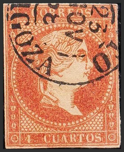 48. 1855. 4 cuartos rojo. Matasello QUINTO / ZARAGOZA (Tipo I). BONITO Y RARO.