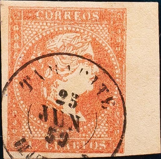 48. 1855. 4 cuartos rojo. Matasello TAMARITE / HUESCA. BONITO Y RARO.