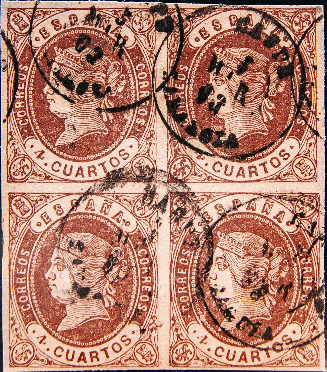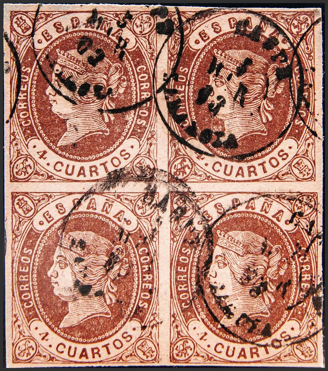 58(4). 1862. 4 cuartos castaño, bloque de cuatro. Matasello CASPE / ZARAGOZA. MAGNIFICO.