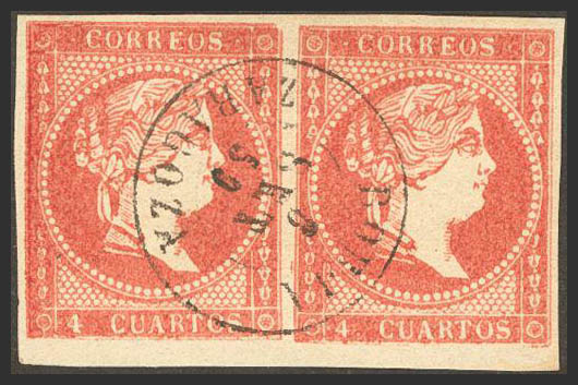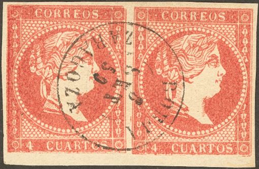 48(2). 1856. 4 cuartos rojo, pareja. Matasello BORJA / ZARAGOZA. MAGNIFICO.