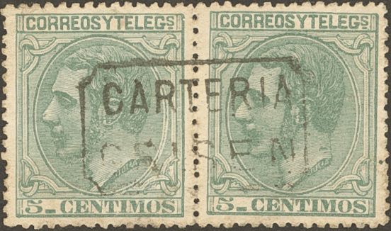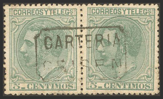 201(2). 1879. 5 cts verde, pareja. Matasello CARTERIA / GRISEN, de Zaragoza. MAGNIFICO.
