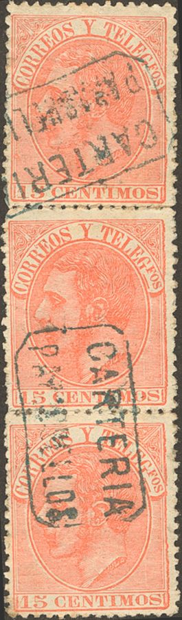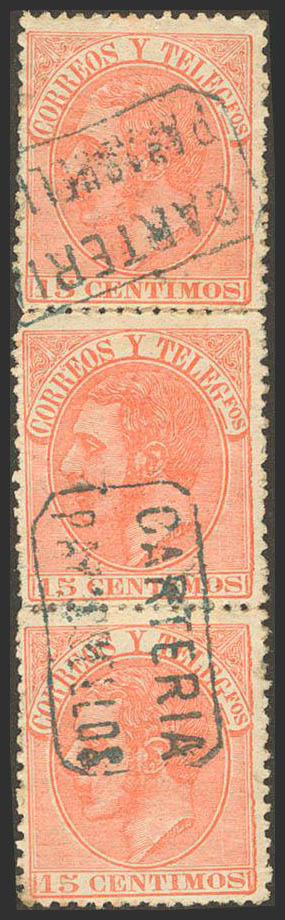 210(3). 1882. 15 cts naranja, tira vertical de tres. Matasello CARTERIA / PARACUELLOS, de Zaragoza. MAGNIFICO.