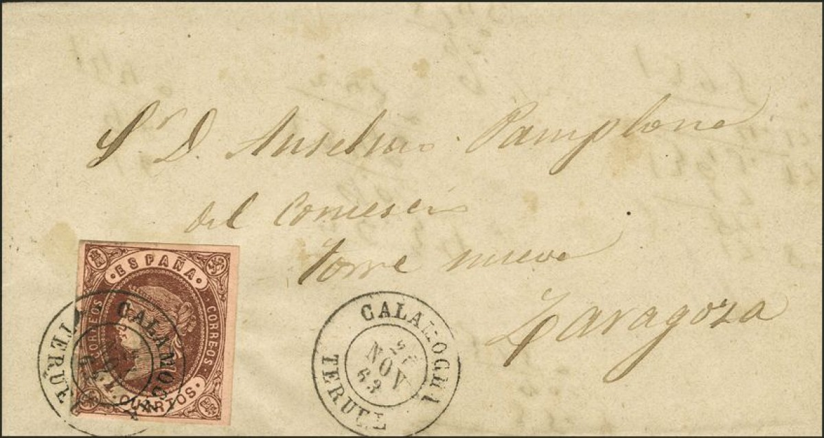 58. 1863. 4 cuartos castaño. CALAMOCHA a ZARAGOZA. Matasello CALAMOCHA / TERUEL. LUJO