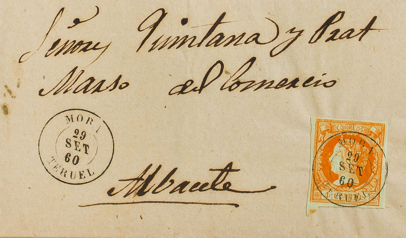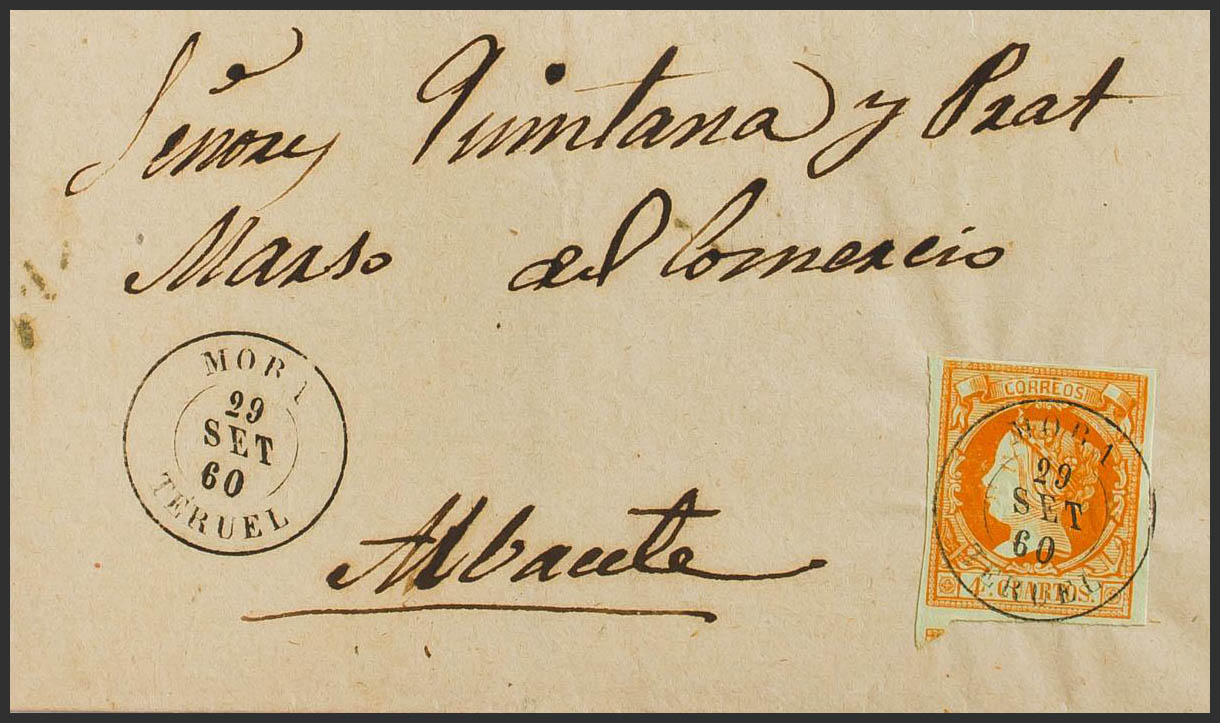 52. 1860. 4 cuartos amarillo. MORA a ALBACETE. Matasello MORA / TERUEL. MAGNIFICO.