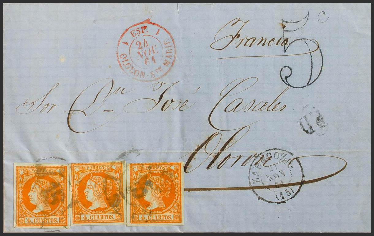 52(3). 1861. 4 cuartos amarillo, tres sellos. ZARAGOZA a OLORON (FRANCIA). MAGNIFICA E INUSUAL FRANQUEO PARA COMPONER LA TARIFA DE 12 CUARTOS A FRANCIA.