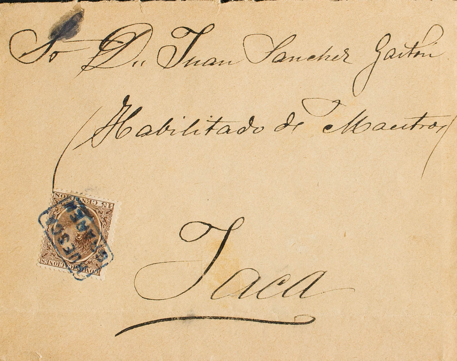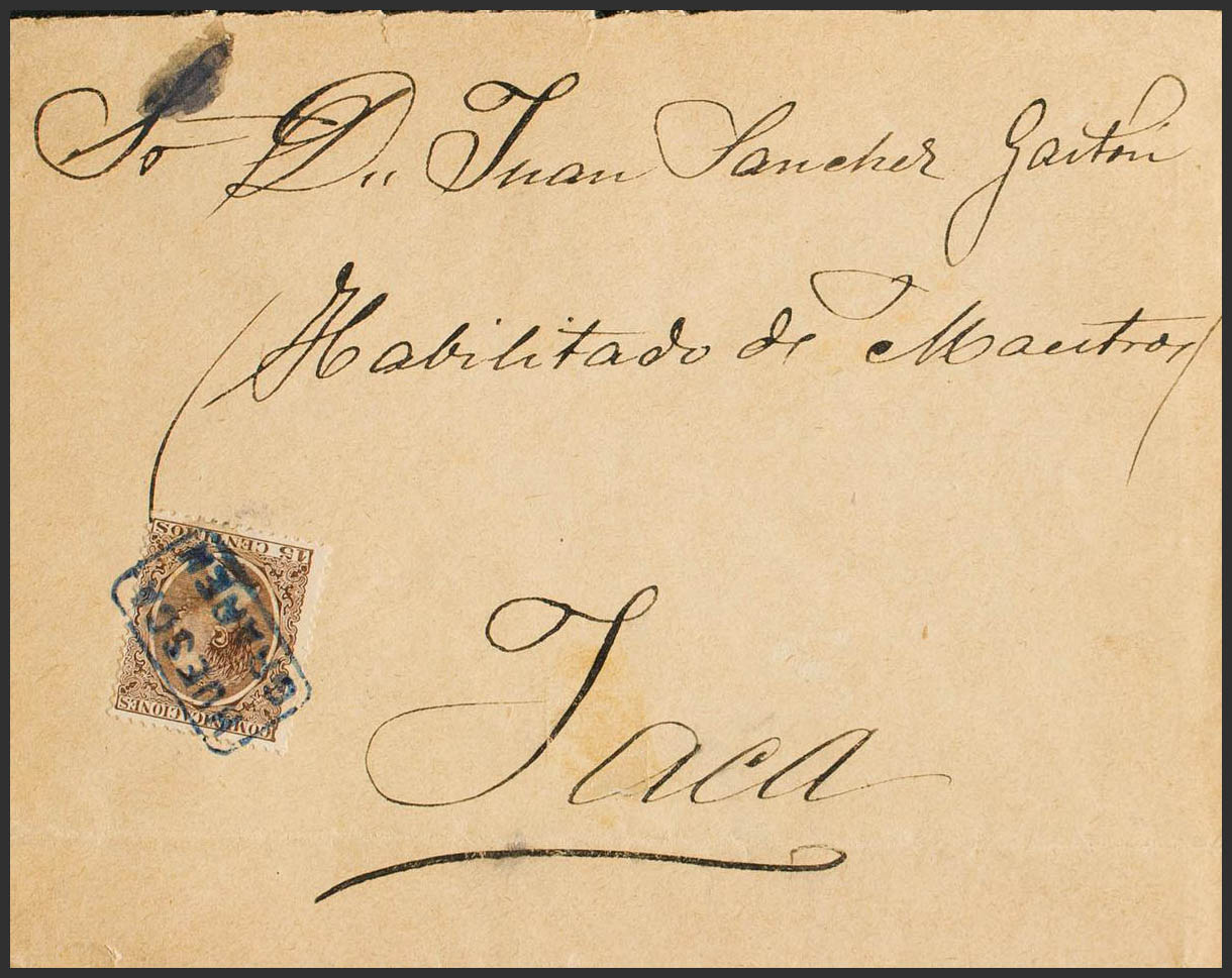 219. (1889ca). 15 cts castaño. GRAÑEN (HUESCA) a JACA. Matasello cartería HUESCA / GRAÑEN, en azul. MAGNIFICA Y MUY RARA.